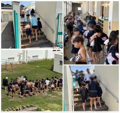 1年生と6年生は合同でプール開きを行いました。1年生は小学校のプールに入るのは初めてです。6年生のお兄ちゃん、お姉ちゃんと一緒に入ります。