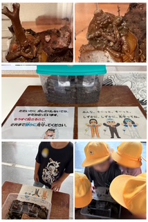 校長室の前に「カブトムシのサナギ」が置かれました。子どもたちは興味津々でのぞいていました。