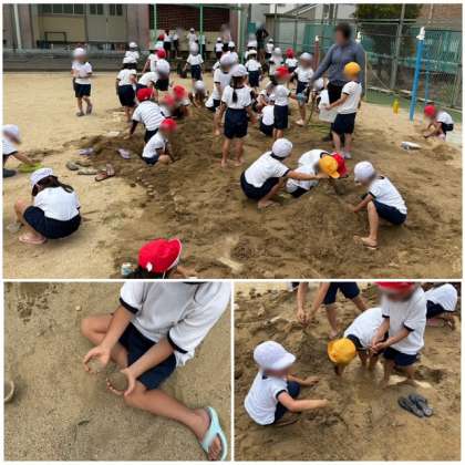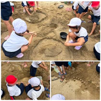 砂場で、お団子を作ったり、山を作って池に水を貯めたり、プリンの容器で型をとったりしました。みんな楽しく遊びました。この後はプールで汗を流します。