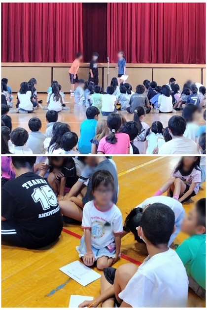 今朝は児童集会(なかよし班集会)がありました。カーテンの間に何が通ったかをなかよし班で当てるゲームをしました。