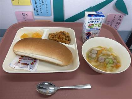 7月14日(月)の献立は「コッペパン(いちごジャム)・牛乳・押麦のチキンパエリア ウインナーとキャベツのスープ・ミックスフルーツ(缶)」でした。