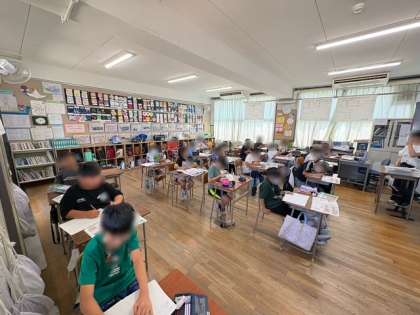 5年生は社会科のまとめのテストです。テスト直前の教室は、ノートを見返したり教科書をチェックしたりして静かに学習していました。