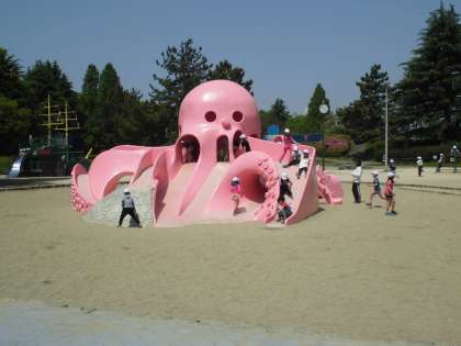 学校にあるアスレチックより大型の遊具でおにごっこをしたり、勢いよく滑り台を滑ったり、タコの滑り台の壁によじ登ったりと、元気いっぱい遊びました。キャー、キャーという楽しそうな歓声が、あちらこちらから聞こえてきました。