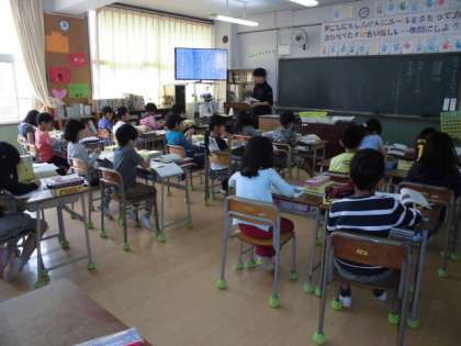今日は説明文『自然のかくし絵』の学習。たくさん難しい言葉が出てきます。そこで、教室の大きなテレビに辞書をうつしながらみんなで意味調べを行いました。どんどん速く正確に辞書を活用できるようになってきています。