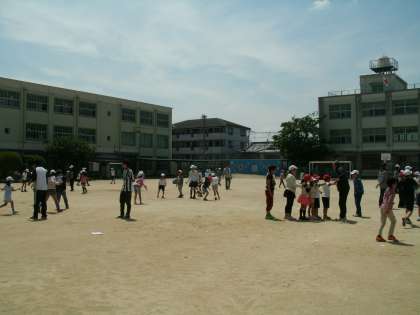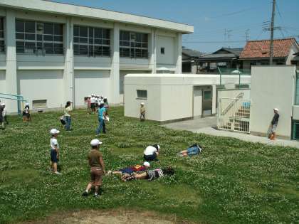運動場にはさんさんとお日さまが照り、体を動かすと汗ばむ陽気でした。その中で、「大なわ」をしている班があり、上の学年の子が、1年生の子も跳べるように縄をゆっくりと回したり、縄に入るタイミングを教えたりしていました。体育館では、「ハンカチ落とし」をしている班があり、どの子もおにになることができるように工夫して盛り上がっていました。アスレ広場では、クローバーがたくさん咲いている芝生の上で、気持ちよさそうに「だるまさんの一日」をしていました。その他、自分達で話し合った遊びを、班長を中心に協力し合って楽しく取り組んでいました。