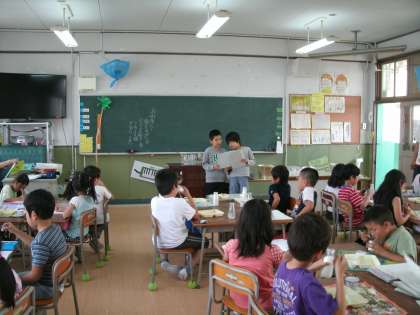 給食の時間、6月に行われる東小フェスティバルについて、代表委員会の人が教室に来て、前日の代表委員会で話し合われたことを報告してくれました。