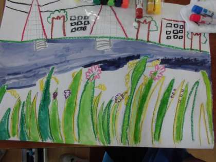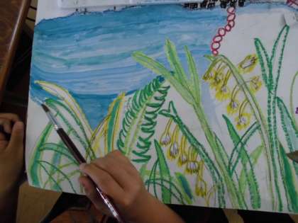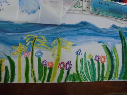 青に緑や、黄色、茶色、赤、オレンジなどをまぜまぜ・・・納得するまで色を作り、川の流れにそって丁寧に筆をはこんでいました。
