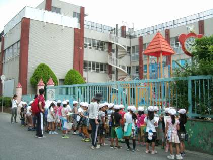 まずはじめに向かったのが東小学校のお隣にある『天宗学園保育園』。この保育園から本校に入学した子ども達は多く、「小学校と違って運動場が狭いなあ。」「遊具があるなあ。」「0歳から6歳の子ども達が通っているんだって。」と、懐かしそうに見学していました。