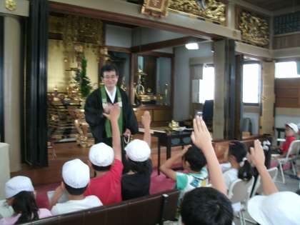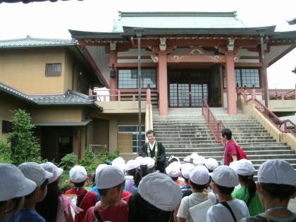 少し歩いたところに、『常栄寺』がありました。ここでは、住職さんがいろいろと詳しくお話をしてくださいました。初めは境内でのお話でしたが、「お堂の中には何があるのですか?」との質問に、わざわざお堂の中に入れてくださり、さらに詳しくお話をしてくださいました。たくさんありすぎて、ここでは全部紹介することはできませんが、大きく2つのことが印象に残りました。1つ目は、この常栄寺が矢田地域の学校の始まりであること。2つ目は、「住道:すんじ」という地名は、学校の北東にある『中臣須牟地神社:なかとみのすむじじんじゃ』が由来となっていること。2年生にとっては少し難しいお話もありましたが、とても優しくていねいに教えてくださいました。