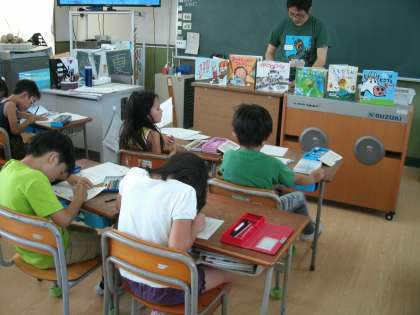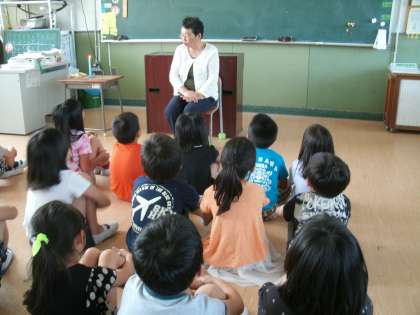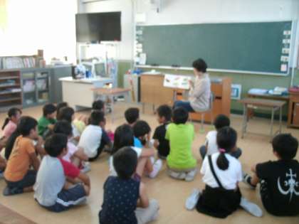 本校が読書活動を推進していることは、今まで何度かご紹介しています。子ども達の感性を豊かにし、知識や想像力、様々なものを育むために本を読もうという取り組みです。しかし、まだ2年生ですのでどのような本があるのかそれほどたくさん知っているというわけではありません。そこで、「いろいろなジャンルの本の世界を知り、読書の幅を広げよう」そして、「お話を聞いてイメージをふくらます力を育てよう」と、今日『お話玉手箱』を行いました。この催しは、東住吉図書館から語り部の方が来て、絵本の読み聞かせや本の語りをしてくださるもので、子ども達が楽しみにしている行事の一つです。