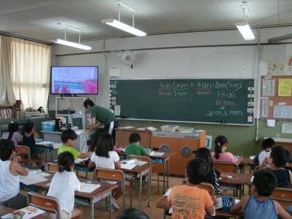 今、算数では、長さの学習をしています。cm:センチメートル,mm:ミリメートル,cmからmmへ、mmからcmへ単位を変えて長さを表す,ものさしの使い方や直線にひき方など、学習する内容はたくさんあります。しかも、よく似た単位を扱うので、とてもややこしい単元です。そこで、一斉授業で説明した後、子ども達一人一人のところに担任が行き、理解しているかどうかを確認しながら、学習を進めています。