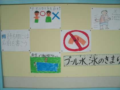 写真のポスターは、体育委員会の子ども達が委員会活動の時に作成し、プール開き集会の時に使用したものです。このポスター作りのほか、体育委員会の子ども達は、プールの更衣室を清掃するなど、全校のためにがんばってくれました。