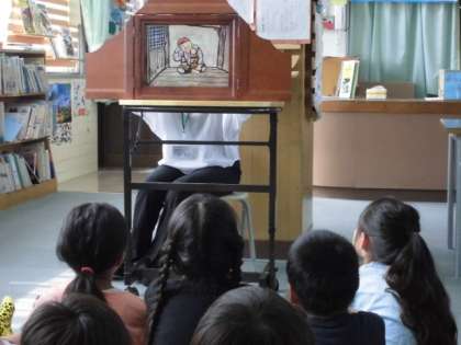 本を選ぶと集中して読書に励み、どんどん本の世界に引き込まれているようでした。さらに、鎌田さんが紙芝居を2話読んでくださいました。「桃太郎」と「こぶとりじいさん」です。子どもたちは登場人物の行動に一喜一憂しながら、しっかりお話を聴くことができました。特に「こぶとりじいさん」が終わったあと、
