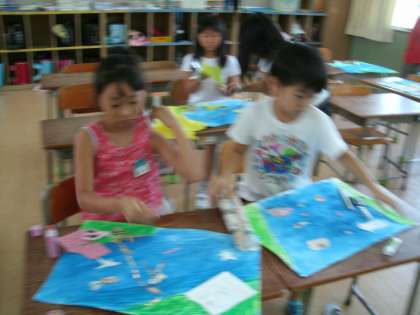 2組は、図工の学習です。模様のついた紙やフエルトなど、いろいろな素材を魚や水草の形に切り、それを1学期に描いた川の絵にのりで貼り付けていきました。特に、絵だからと言って平面にこだわらず、立体的な水草やヒトデを作ったりしていたことには、発想の豊かさに驚きました。