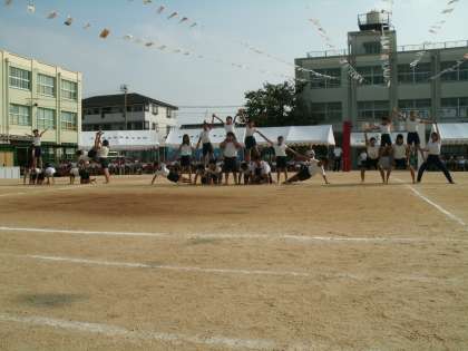 運動会の大トリは、6年生による『ONE〜新たな一歩〜』です。高さや技の制限がある中で工夫を凝らし、集団行動を取り入れて調和のとれた新しい組立体操を披露していました。軽快な音楽に合わせて楽しさを、ゆっくりとしたリズムでしなやかさを、太鼓に合わせて力強さを、自分の体を、そして、学年の力を結集して見事に『ONE』を表現していました。矢田東小学校の伝統ある組立体操に、プログラム名通り新たな一歩を確実に記した演技でした。