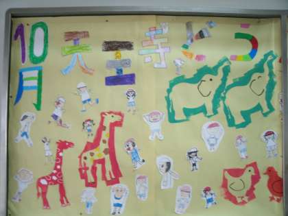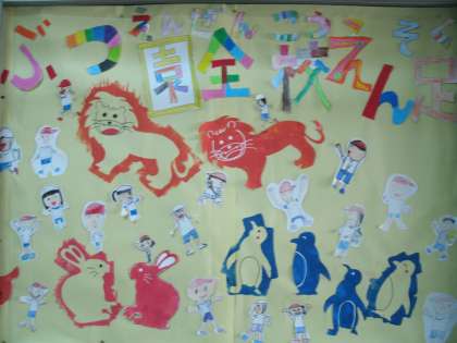 今週末に実施予定の天王寺動物園への全校遠足をイメージしています。子ども達一人一人が描いた自分の分身と型紙に色を塗って仕上げた動物を台紙にちりばめて、動物園を巡っているところがかわいく表現されています。子供たちが遠足を楽しみにしているというわくわく感が伝わってくる楽しい玄関掲示が出来上がりました。