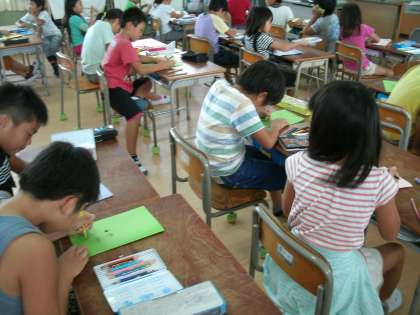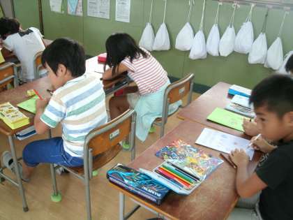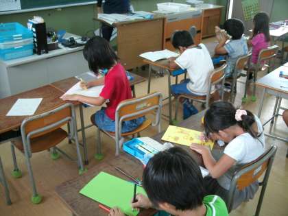 国語の時間に、日ごろお世話になっているお家の人へ『ありがとう』の気持ちを伝える手紙を書きました。先日行われた運動会に来てくれたことやお弁当を作ってくれたこと、夏休みにどこかに連れて行ってくれたことなどについての感謝の気持ちを書いていました。自分の身近なところを振り返ると、とてもたくさんお家の人にお世話になっていることが改めてわかったようでした。文章を書き終えると、台紙に絵を描き、子ども達の真心がこもった手紙ができあがりました。