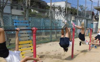 逆上がりができる子もできない子も、補助板を使いながら、くるんと鉄棒を回る感覚を経験することができました。
