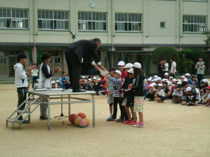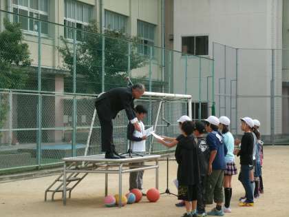 その後、先日行われた全校遠足の表彰式が行われました。天王寺動物園を舞台になかよし班で行われたオリエンテーリングでは、300点満点中270点をとった18Aが見事優勝しました。2位は4グループ、3位は2グループいて接戦の中での優勝でした。4位以下のグループにも校長先生からよくがんばりましたということで表彰状が渡され、楽しい思い出がたくさんできた全校遠足は終わりました。