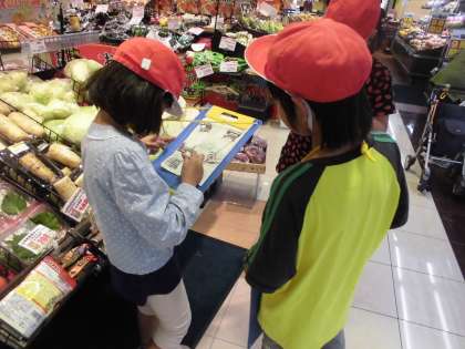 子どもたちは「魚を切るところはこうなってるんだ。」や「お肉や魚は、種類ごとにきれいに並べられているね。」などと、たくさんの発見をすることができました。