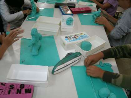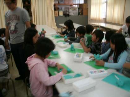 掃除の後、ランチルームで1・2組合同の図工科の学習を行いました。『思い出をかたちに』というテーマで、運動会での思い出の1シーンを粘土で表現しました。大玉転がし、ダンス、障害物競走をした時のことを思い出し、工夫を凝らして作成しました。粘土を細く丸めて白線を表現したり、赤白帽子のゴムひもを付けたり、大玉にチャックを付けらり、力強さを表現するために足を太くしたり…。子ども達の表現力に感心させられました。
