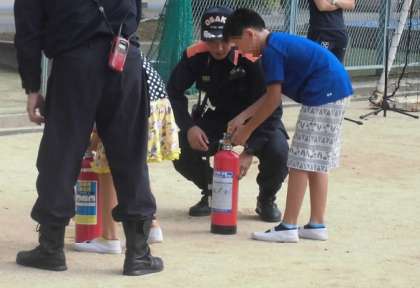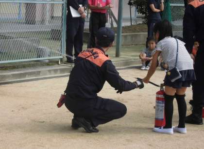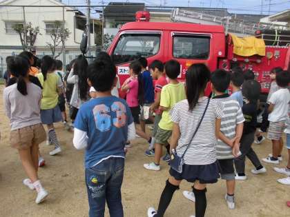 校長先生や消防署の方からのお話を聞いた後は、事前に決められた代表者の子どもたちが消火体験を行い、その後消防車についての説明を受けました。写真はその時の子どもたちの様子です。