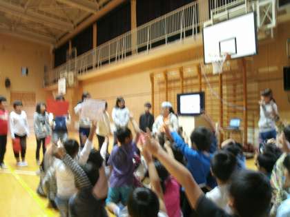 学年交流会では、5年生が赤おにさんとの懸け橋になって交流会を進めました。一番はじめにした『クイズ!赤おにさん』は、赤おにさんについての三択クイズを解きながら赤おにさんのことを知っていきました。その後、『ゲーム!赤おにさんが言いました』をしました。このゲームは、「赤おにさんが言いました」というキーワードがついた時にだけ指令通りに動くというゲームで、勢い余ってキーワードのついていない指令に従ってしまった時は、ショックで倒れ込んでしまう子もいました。その他、『ゲーム!つっかまえた〜』『ゲーム!じゃーんけーん』など、いろいろな活動をしました。その中で、赤おにさんとハイタッチや握手をしたり、いっしょに笑い楽しんだりして、体のふれあいだけでなく、心のふれあいもできました。