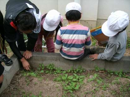 二十日だいこんがずいぶんと大きく育ってきました。ものさしを使って、「○センチもあるで〜。」と嬉しそうに言う子ども達。でも、その横には、雑草もはえています。はじめ子ども達は「先生、これ二十日だいこん?」とよく聞いてきましたが、だんだん、葉の形の違いや茎の付け根の色などから「これは二十日だいこんだ。」「これは雑草だ!」と見分けようとするようになりました。見分ける知恵を身に付けたんですね。