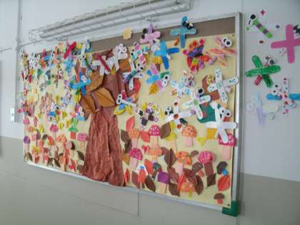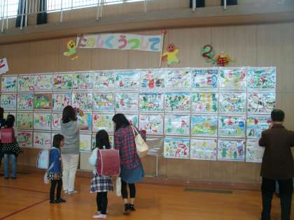 今日は作品展も開催されました。以前のホームページで何度か取り上げましたので、作品についての詳しいコメントは書きませんが、見ていただいてどうだったでしょうか。色とりどりで、子ども達の工夫や豊かなイメージが伝わってくる素敵な動物ワンダーランドに仕上がっていたと思います。