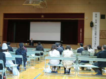 その後、本校の教育実践に様々なアドバイスをいただいている大阪大学教授の志水宏吉先生に「家庭・地域・学校の協働で学力を育む」と題しました講演会を行っていただきました。子ども達の学力を高めるために、家庭、地域、学校、それぞれに役割があり、その連携が大切であることを、志水先生の長年にわたる研究の実績を踏まえ、ご示唆くださいました。