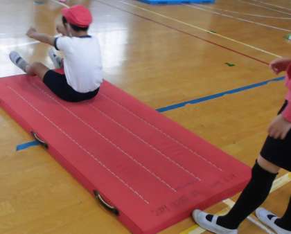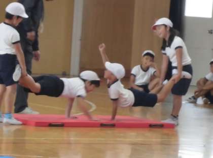 準備運動では、チームごとの対抗戦やチームの仲間同士の対決など、競い合いながら楽しくマット運動に取り組むことができました。