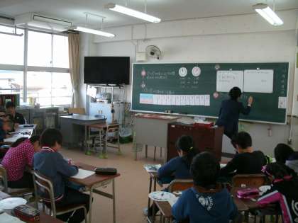 今日、本校の研究計画に基づき、4年2組で算数科の授業研究会を行いました。学習したところは、「どのように変わるか調べよう」で、子ども達が学習のめあてを捉えて考えを深めることができるように、指導者が手作りした具体物を使って学習を進めました。ペア学習やグループ学習では、協力して活動に取り組み、話し合い活動を通してめあてに即した気づきを互いに出し合って考えを深めていきました。そして、クラス全体での発表ボードを用いた意見交流で、学習のねらいに迫っていきました。
