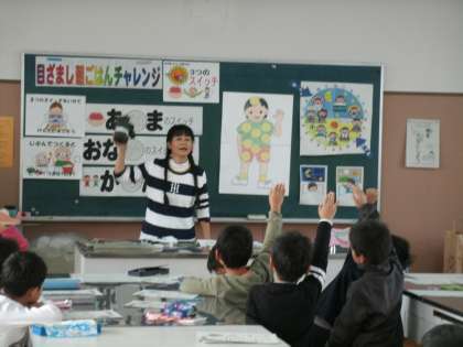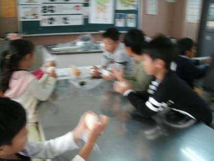 朝ご飯を食べると、頭・お腹・体の3つのスイッチが入ります。このスイッチが入ることによって、体を健康に保ち、元気に過ごすことができます。このことをまず教えていただきました。その後、子ども達でも簡単に、しかも短時間に作れるおむすびを作りました。ソフトボールのようなおむすび、三角のおむすび・・・。いろいろな形のおむすびができあがりました。そして、ぱくっ!おいしそうに試食していました。