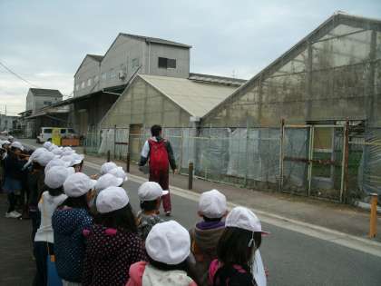 『ヘルメスソース』の工場のあとは、矢田中学校の横を通り、ビニールハウスを見学しました。本校は大阪市内に位置しますが、緑豊かな地域があり、そこにはビニールハウスもあります。外から少し中をのぞいて、中がどのようになっているのか、どんなものが栽培されているのか、興味を持って探検しました。