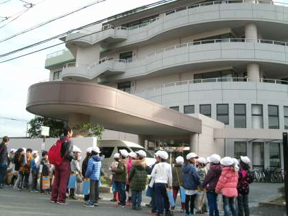 それから、ぐるっと東側を歩き、老人保健施設『たちばな』に着きました。これまで『グループホームいこいの守』『特別養護老人ホーム花嵐』『グループホームはなの街』など、お年寄りの施設を探検しましたが、それらの施設との違いを担任から説明を受けました。