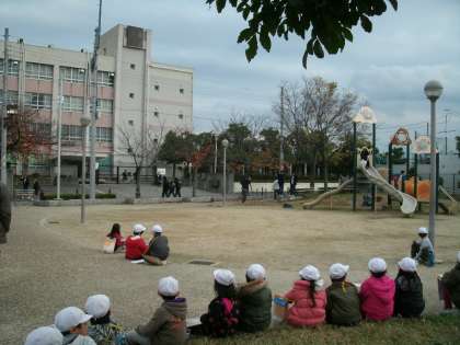 そして、矢田中学校の南側を通り、子ども達がよくお世話になっている『青空公園』に着きました。日頃遊んだりして使っている公園ですが、探検ノートに書くとなると、日頃気付かないことにもいろいろ気付き、探検ノートに書いていました。