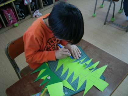 12月に入り、巷ではクリスマスソングが流れてきたり、クリスマスの飾りが飾られるようになりました。子ども達も、今からクリスマスを楽しみにしているようです。その表れか、けっこうクリスマスツリーを形どった作品が見られました。それ以外にも、たくさん窓のある作品や家の形をした作品、人の顔や水族館をイメージした作品もありました。子ども達の自由な発想、子どもらしさにあふれた作品がたくさんできあがりそうです。