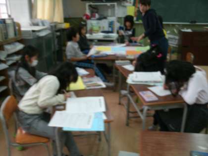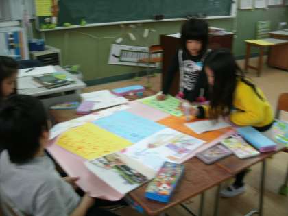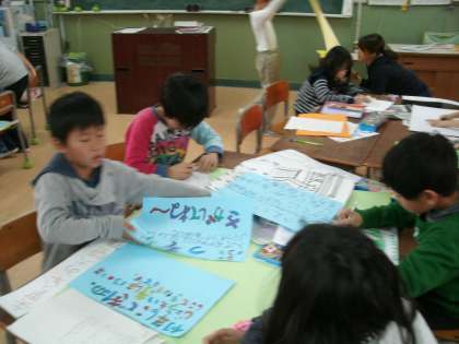一人一人が、自分の担当する役割を一生懸命果たしています。ある子は、わき目も振らずに黙々と文を書き、ある子は教室の床に大きな紙を敷して記事を割り付け、あるグループはよりよい発表会にしようと友達同士でアドバイスをし合い・・・。