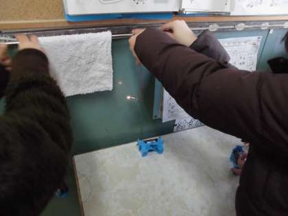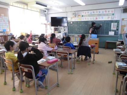 教室の中にあるいろいろなものに導線を触れさせ、電気を通して上手に回路が作れるか挑戦しました。ふでばこやはさみ、机の脚や黒板などいろいろなもので調べた結果、金属は電気を通すということを知ることができました。
