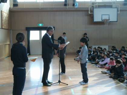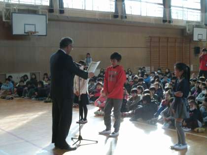 続いて、11月に行った読書月間の表彰についてです。クラス部門と個人部門とがあり、読書月間中に読書に親しんだ上位3クラスと、学年内上位3名が表彰されました。クラス部門では5年1組、その次が5年2組、3年2組と続きました。個人部門では、計18名が全校の前で表彰状を手にしました。名前が呼ばれるたびに全員から拍手が起こり、がんばったクラス・人をたたえていました。