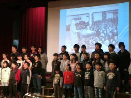 6年生の発表内容は、『変わらないもの〜全国水平社の運動・日本と朝鮮のつながりの学習を通して〜』でした。6年生は社会科の学習で、人が生まれもって持ち、人間として尊重されるべき権利が踏みにじられてきたことを知り、自分達にできることを考えていく学習しました。その学習を通して、自分、友達や周りの人々を大切にするという決意を持ったことを、力強く発表していました。そして最後に、その思いを、歌声と演奏で、会場の人に伝えていました。