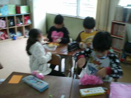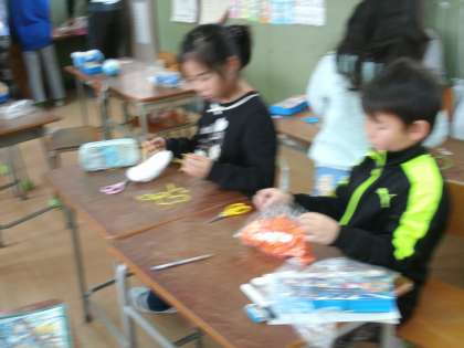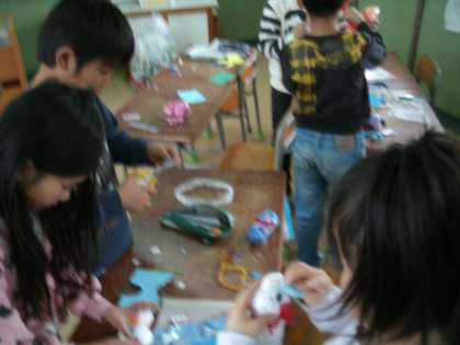 2月の担当は、1年生と2年生です。テーマは『冬』。ビニルぶくろを半分ぐらいに切って、そこにカラーティッシュを詰め、セロテープで口をして、真ん中を毛糸で縛ります。あとは画用紙などを使ってもようを貼ったら、〇〇の完成です。