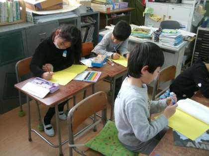 生い立ちの振り返りについては、お家の人からの聞き取ったメモや借りてきた写真をもとに、「○才の時にはこんなことがあった。」「○才の時にあんな思い出がある。」と、その年々のエピソードを記事にして長い画用紙に貼り、巻き物を作りました。それは、教室後ろに展示しますので、ぜひ見ていただきたいと思います。