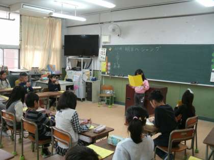 5時間目が始まると、さらに緊張の度合いが高まったようでした。たくさんの友達、お家の人が見ている中で、一人教卓の前に立ち、「3年生に向けてがんばりたいこと」をテーマに発表しました。「習字をがんばりたいです。」「リコーダーをがんばりたいです。」など、自分の思いをがんばって発表しました。