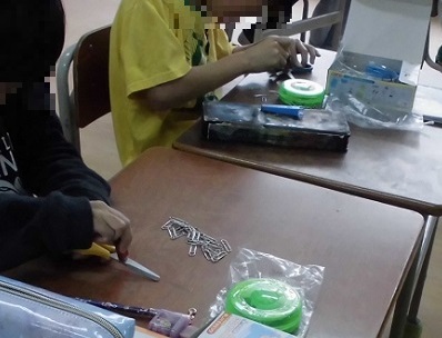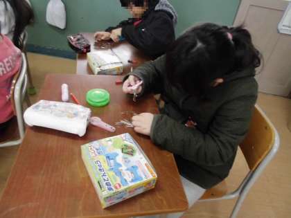 磁石で鉄の物を擦ると、擦ったものも磁力を持つようになります。コツをつかんだ子どもたちは、はさみにクリップを引っ付けて何個持ち上げることができるかなどに挑戦していました!