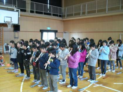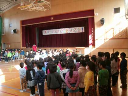 3月22日は本校の第47回卒業式です。卒業式には、在校生を代表して5年生が出席します。残念ながら1〜4年生は卒業式には出れません。そこで、今までお世話になった6年生に感謝の気持ちと中学校へ行ってもがんばってねという気持ちを在校生全員で伝えるために、今日『卒業生を送る会』を行いました。