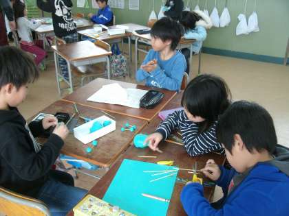 実際に、工作用画用紙(厚紙)を使って箱を作り、面の形や数を調べました。また、頂点や辺の数を調べるために、粘土と竹ひごを使って箱の形も作りました。