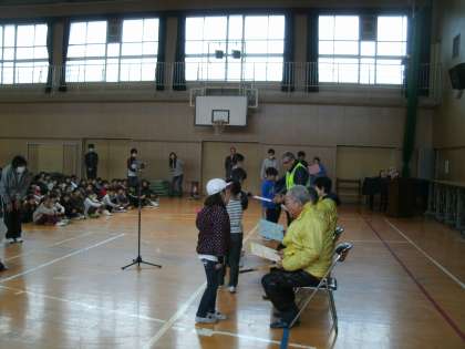 講堂に入ってこられる見守り隊の方を大きな拍手で迎え、『ありがとう集会』が始まりました。まず、児童会の代表が全校を代表して日頃のお礼の言葉を述べました。その後、一人一人が感謝の気持ちを書いた色紙を手渡し、「きみに会えて」を合唱しました。