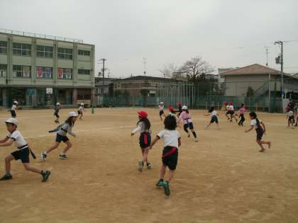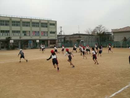 体育科では、赤組、白組に分かれて、「しっぽとり」を行いました。腰にしっぽを付けた攻め手が、笛の合図とともにゴールラインを目がけて走ります。守り手は攻め手のしっぽを取ります。しっぽを取られたら負けになり、取られずにゴールラインを超えると得点になります。