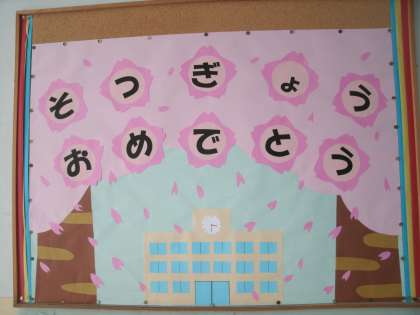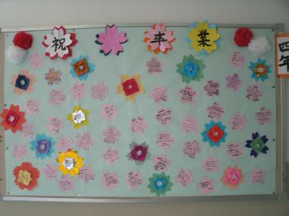 他の学年の掲示板も、6年生の卒業をお祝いする掲示物に変わっています。小学校の思い出を大切にしてねという願いや、6年生への感謝の気持ちを伝えようと、各学年が工夫を凝らして作成しました。